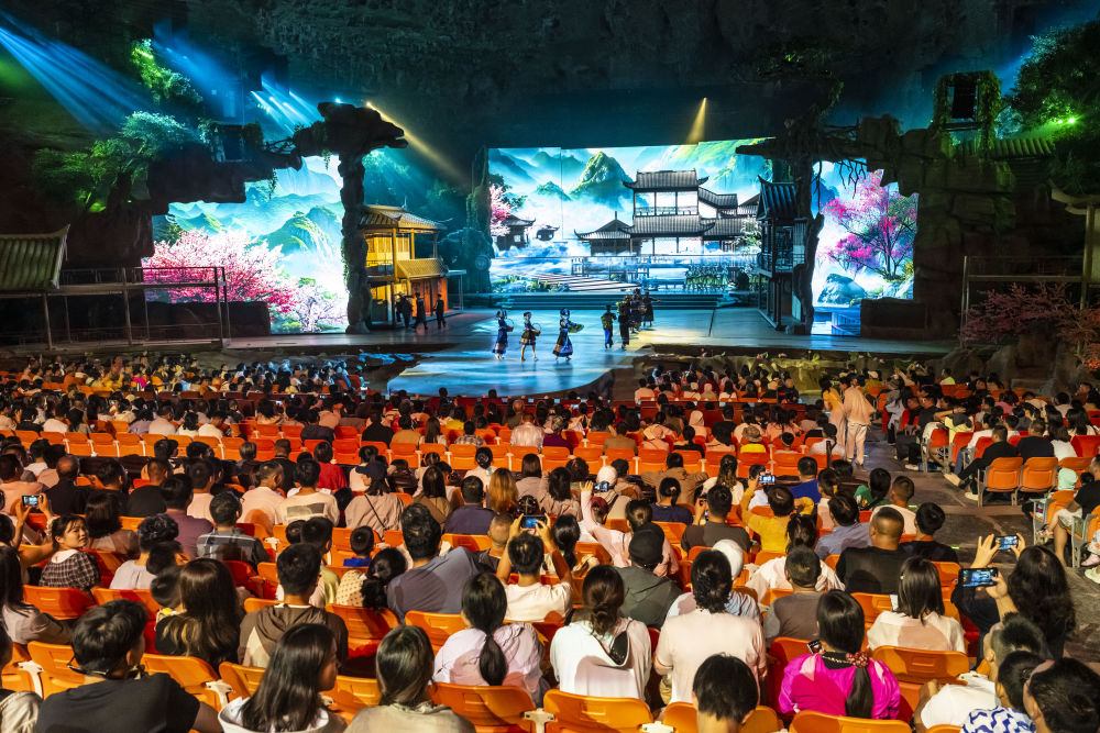 游客在利川腾龙洞景区观看大型民族歌舞秀。新华社发(郑家裕摄)