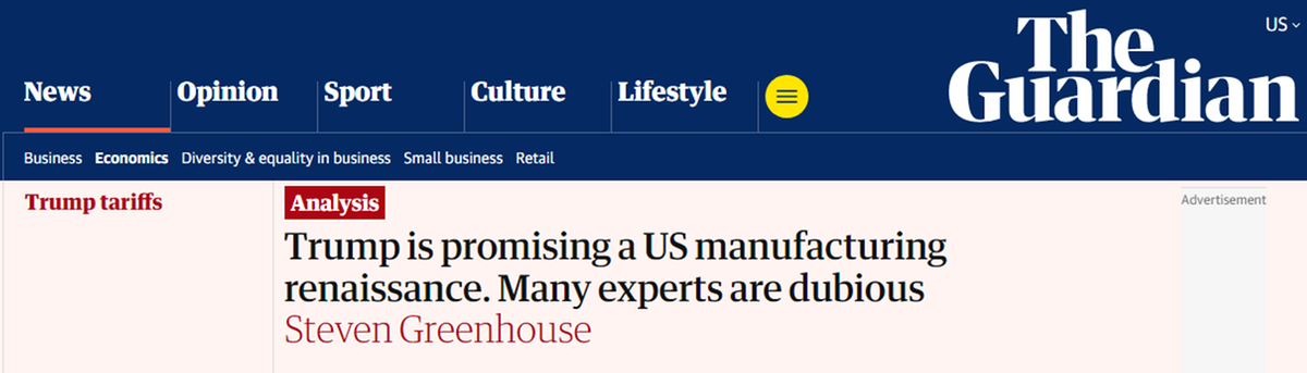 保守派智库美国企业研究所经济政策研究主任迈克尔·斯特兰认为:“(特朗普政府的关税政策)会削弱美国制造业的竞争力,并将减少制造业就业。这些(关税政策)正在提高美国制造业企业的生产成本,进而降低其竞争力。”