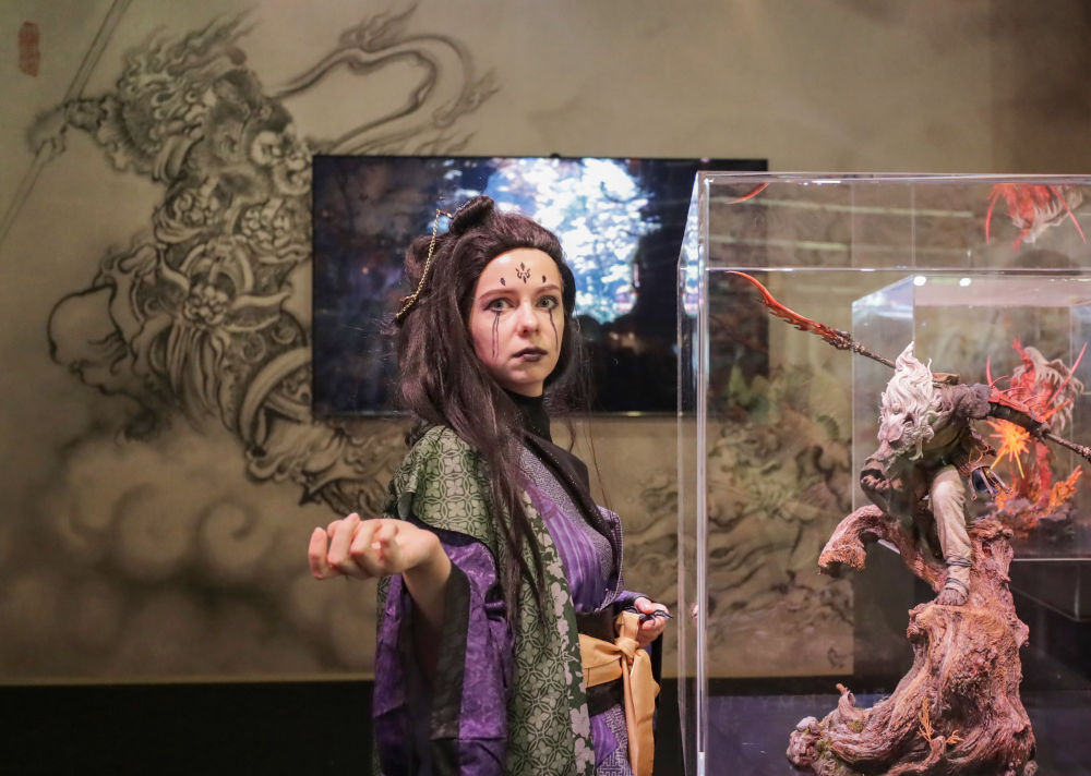 8月20日,在德国科隆,一名《黑神话:悟空》游戏角色扮演者在游戏科学展台与模型合影。新华社记者张帆摄