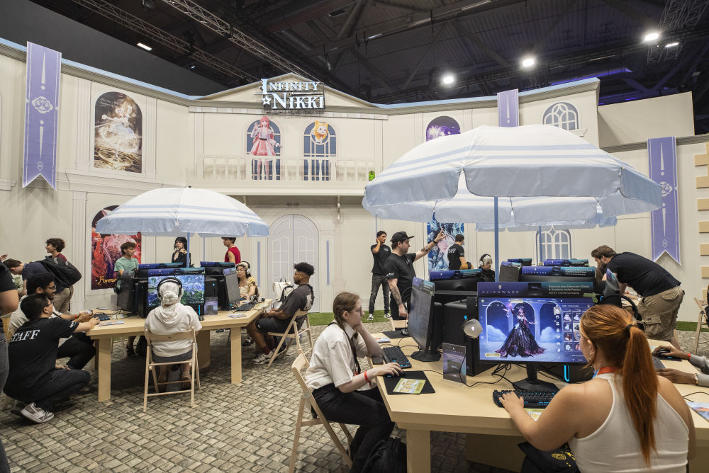 8月21日,在德国科隆,参观者在科隆游戏展叠纸游戏展台试玩游戏《无限暖暖》。新华社记者张帆摄