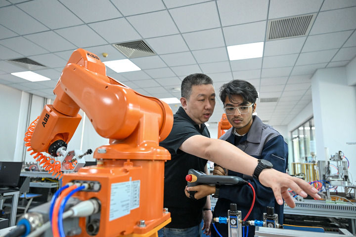 在天津现代职业技术学院鲁班工坊实训教室,老师在课堂上教学生操作自动化设备。新华社记者记者孙凡越 摄