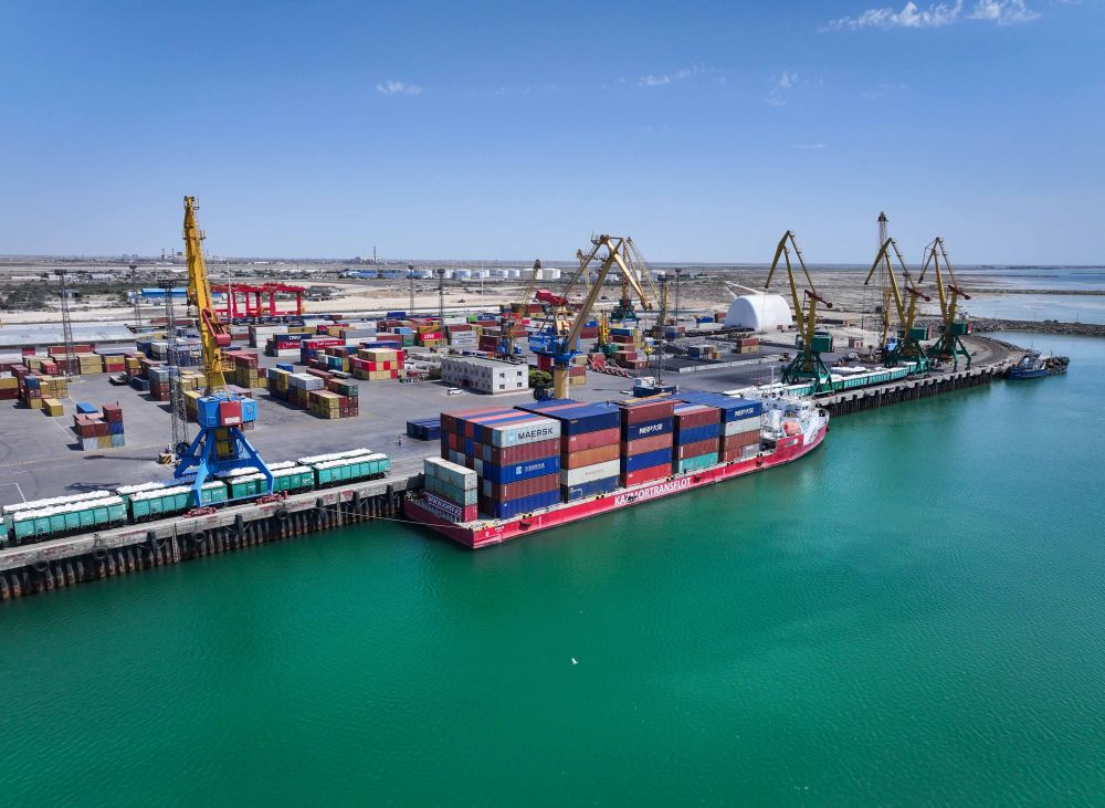 8月6日,一艘货轮停靠在哈萨克斯坦阿克套港(无人机照片)。新华社记者 李任滋 摄