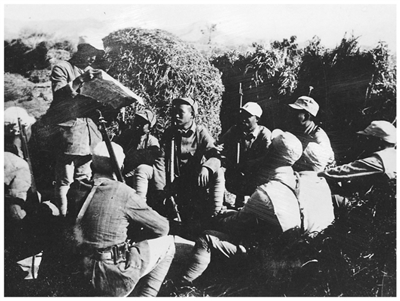 图为百团大战中围坐学习的八路军战士。