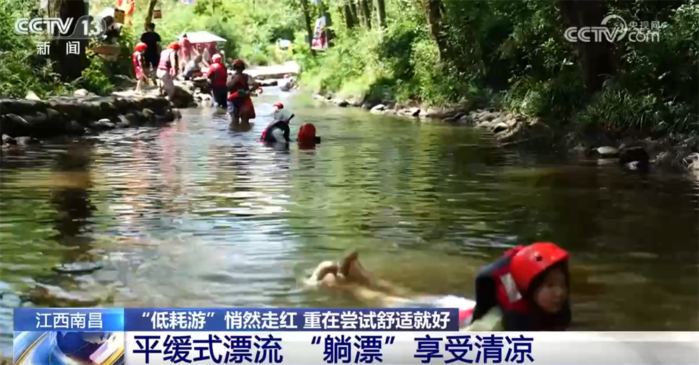 此外,“低耗游”中的“平缓式漂流”也是年轻人热衷的项目。在江西南昌梅岭生态旅游度假区,“躺漂”项目深受欢迎。这种漂流不怕翻船、不用划桨,游客穿戴救生衣和安全帽平躺在水面上,一边享受清凉,一边感受如画风景。