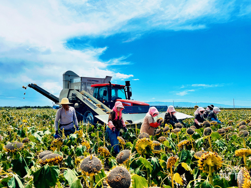 蓝天白云下,农民们与农机协同,在向日葵田忙碌收获(央广网发 马晓甜 摄)