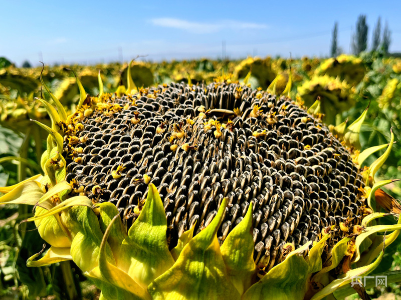 央广网阿拉善8月27日消息(记者刘一晨)初秋时节,内蒙古阿拉善盟阿拉善左旗温都尔勒图镇巴润霍德嘎查的1.3万亩葵花迎来丰收。田间地头,农户们正忙碌地收割、插盘、晾晒,一片喜人景象。沉甸甸的葵花盘压弯枝头,颗粒饱满、色泽金黄,不仅映衬出丰收的喜悦,更照亮了当地群众增收致富的“金色之路”。