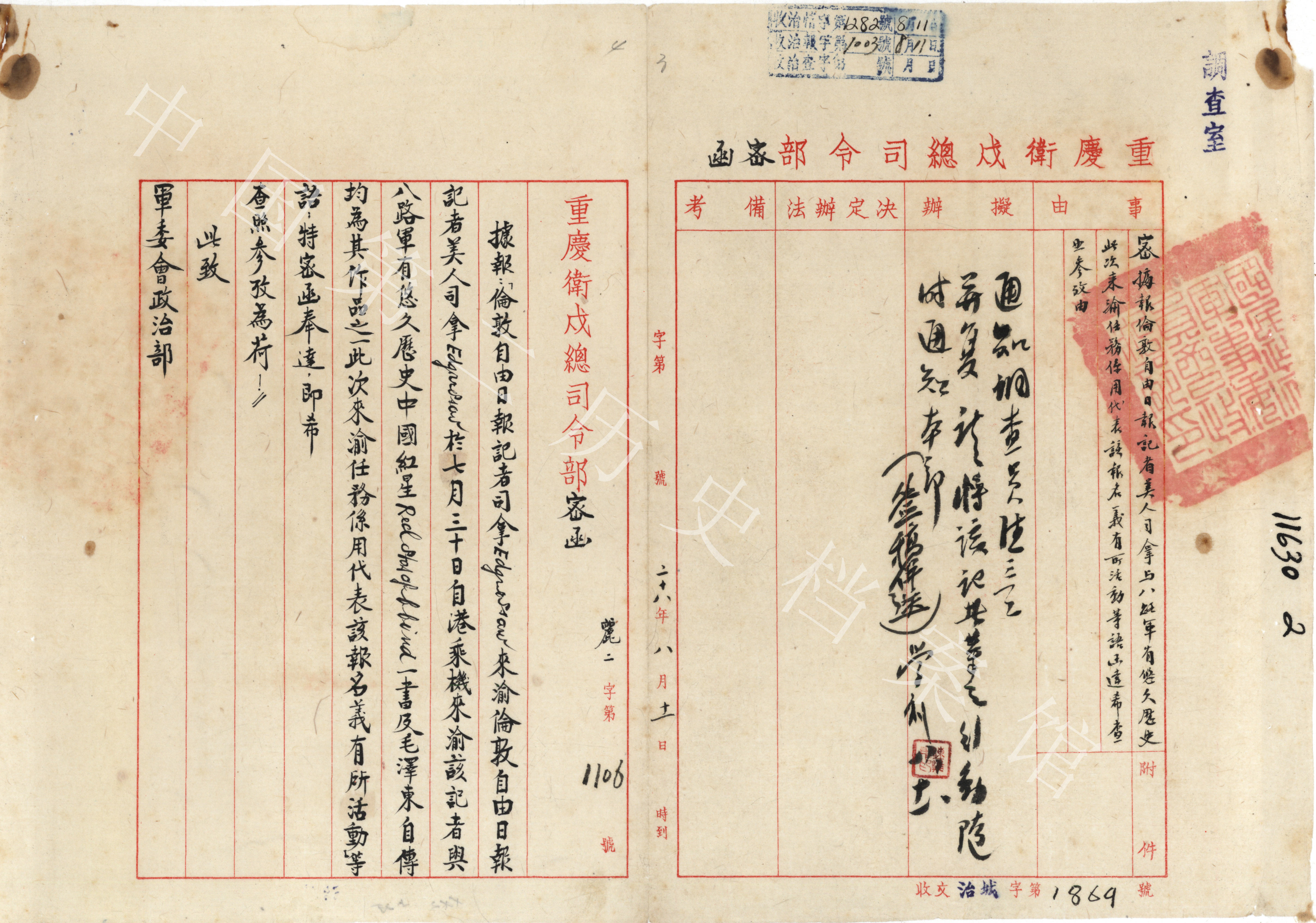 1939年8月重庆卫戍总部向国民政府军事委员会政治部报告斯诺在重庆活动情形的密函(中国第二历史档案馆藏)