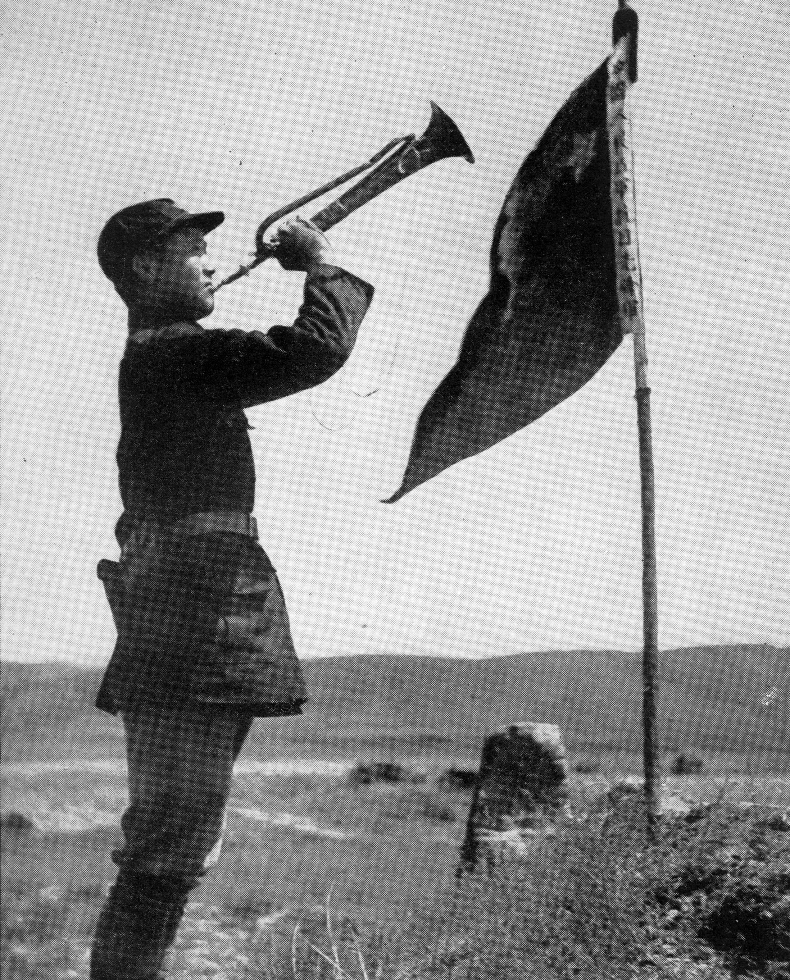 斯诺在预旺堡拍摄的红军司号员,他身边的旗子上写着“中国人民红军抗日先锋军”。