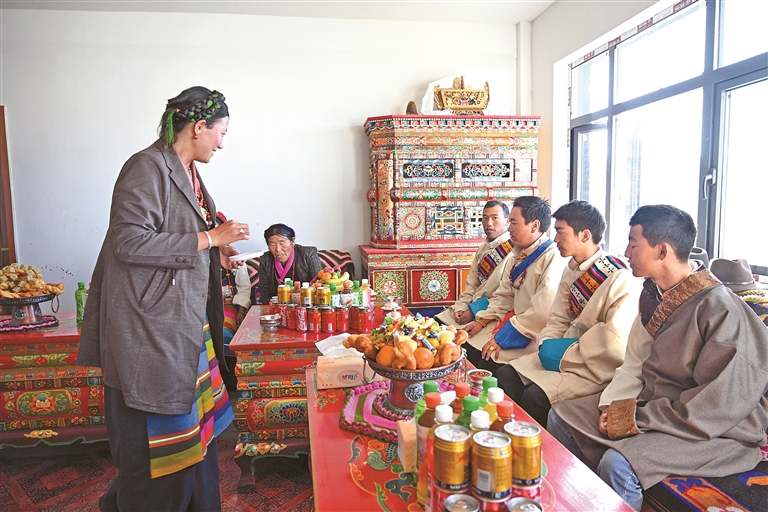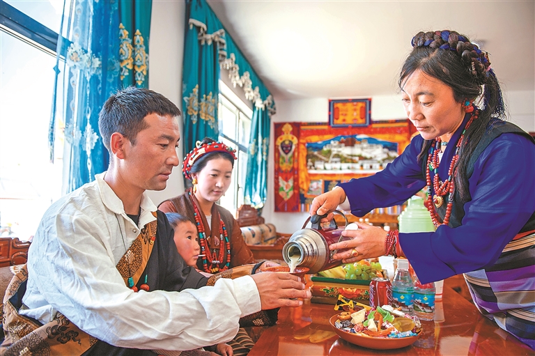 拉孜县锡钦乡夏拉苏村群众搬新家、品美酒。拉孜县融媒体供图