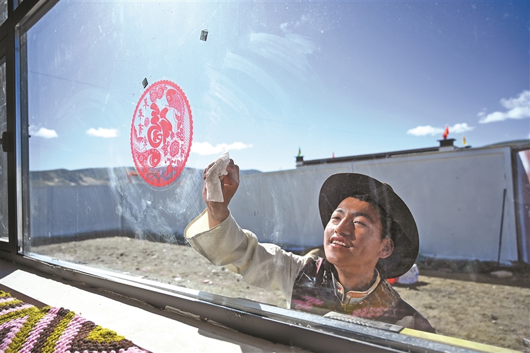 萨迦县雄麦乡扎果村群众擦拭新家窗户。本网记者 扎西顿珠 摄