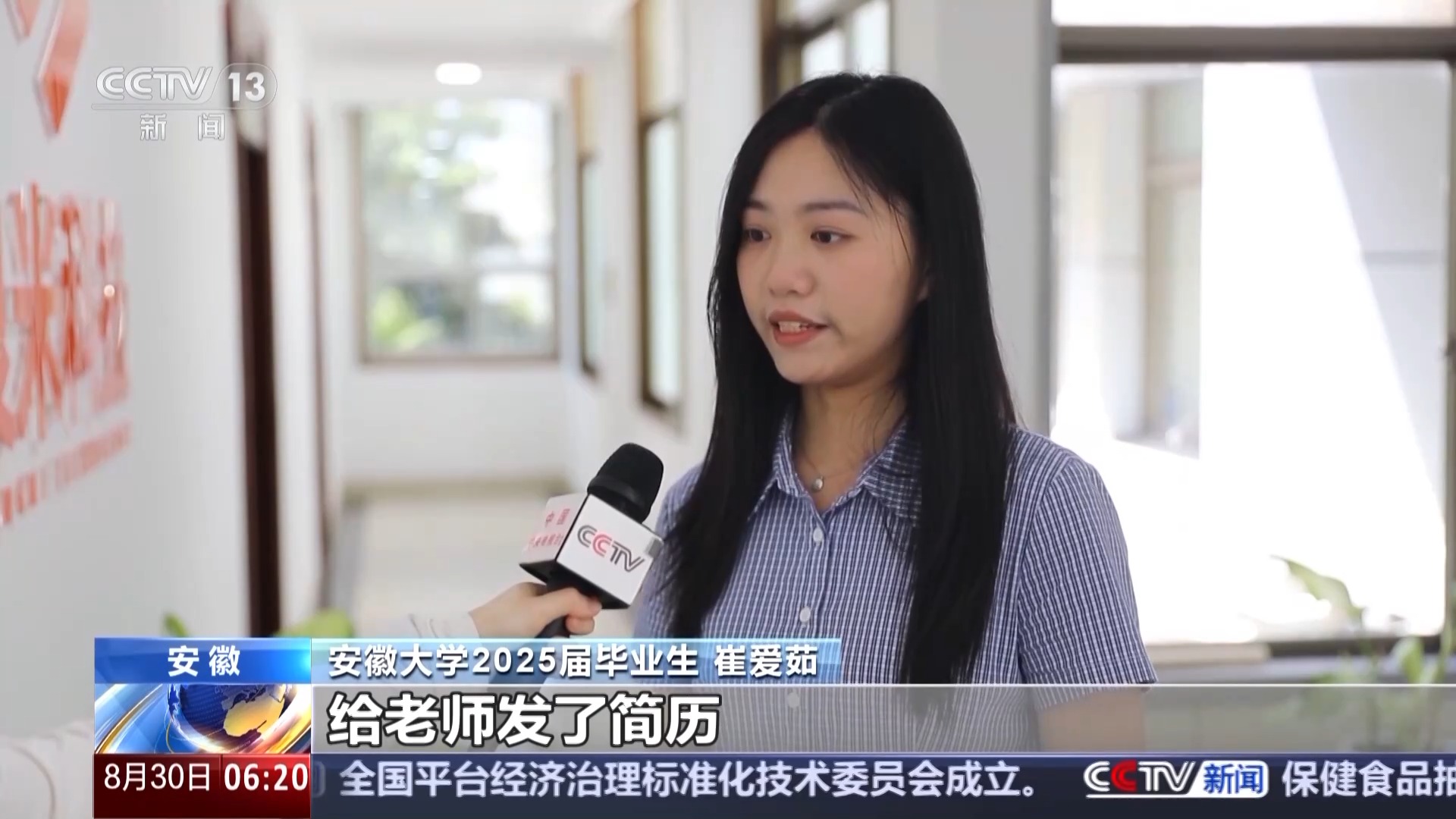 安徽大学2025届毕业生 崔爱茹:我当时已经毕业回家了,给老师发了简历,他帮我转交给企业,面试过之后,我顺利入职了。