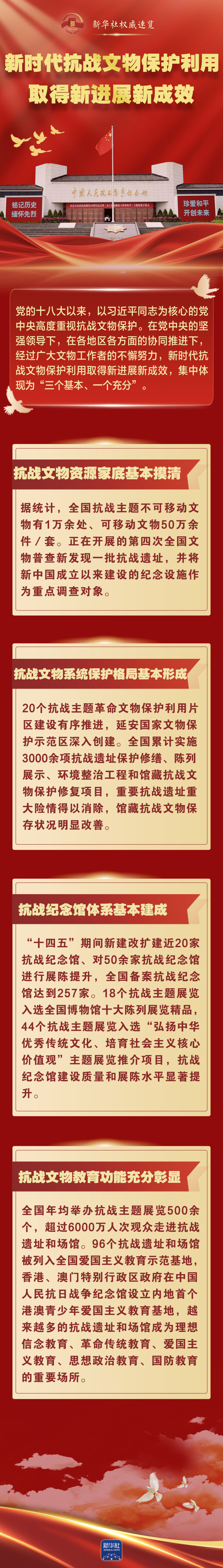 8月31日,中国人民抗日战争暨世界反法西斯战争胜利80周年纪念活动新闻中心举办记者招待会,介绍第四批国家级抗战纪念设施、遗址名录和著名抗日英烈、英雄群体名录,抗战纪念设施和抗战遗址、遗物修缮保护等方面情况。