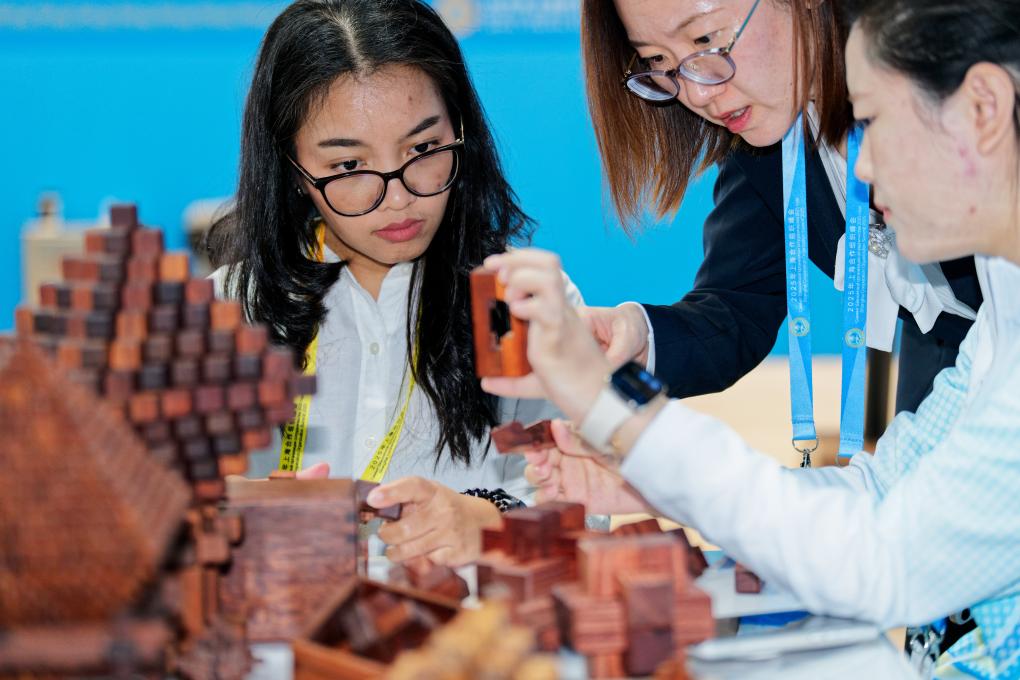 一名印度尼西亚记者(左)在2025年上海合作组织峰会新闻中心了解传统木工榫卯技艺。新华社记者张笑宇摄