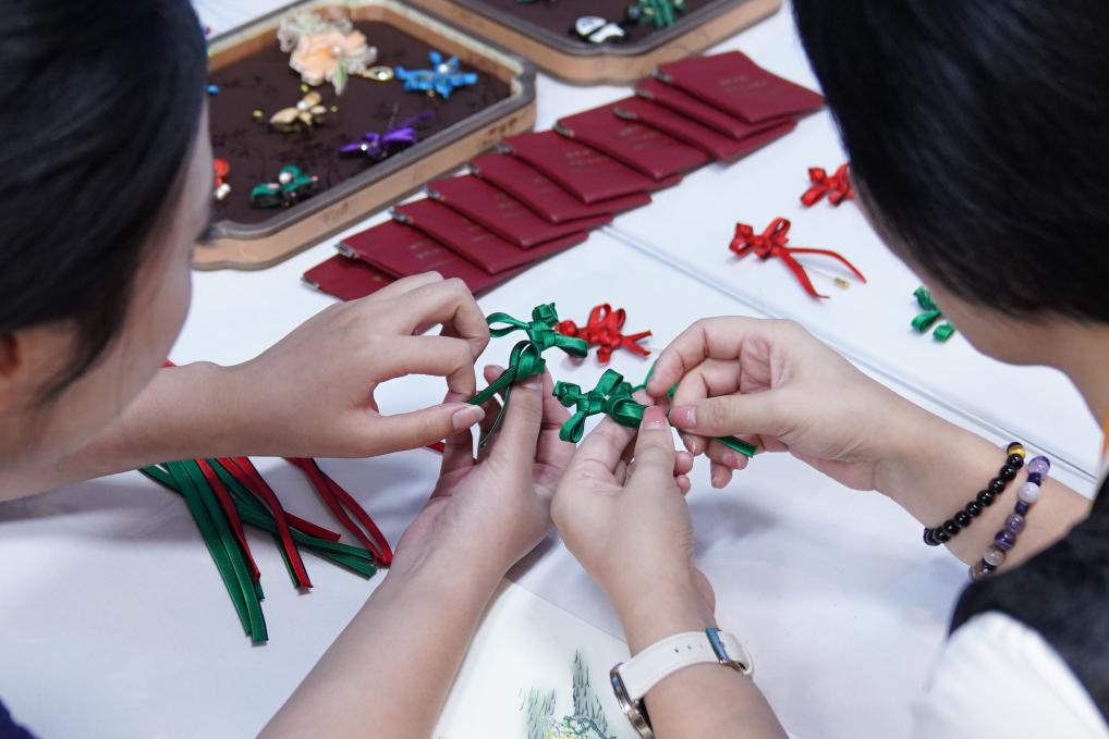 参会记者在2025年上海合作组织峰会新闻中心的曾氏华服传统手工精细制作技艺展台制作盘扣胸针。新华社记者戴明轩摄