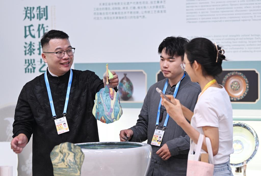 在2025年上海合作组织峰会新闻中心非遗互动展示区,郑勇向参观者演示漂流漆技法。新华社记者李然摄