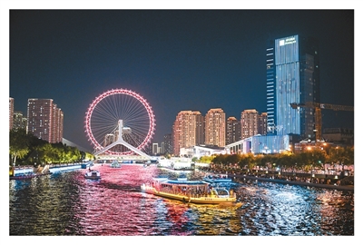 游船搭载游客驶过天津海河三岔河口。