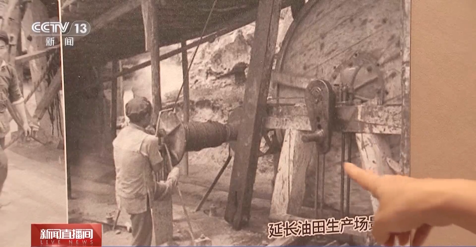 总台央视记者 张春玲:我国科学家利用自己的所学服务了国计民生,也保证了大后方的稳定。这个展板就介绍了在中国共产党领导下,我们打下的第一口油田——延长油田的情况,从这个图片上我们可以看到当时的采油设备非常的简陋,就是用一些木头和金属拼接而成的,就是靠着这些非常简陋的设备,从1939年到1946年期间,我们一共在这个延长油田打出了3100多吨的原油,这些珍贵的原油保障了我们边区军民的用油需求。