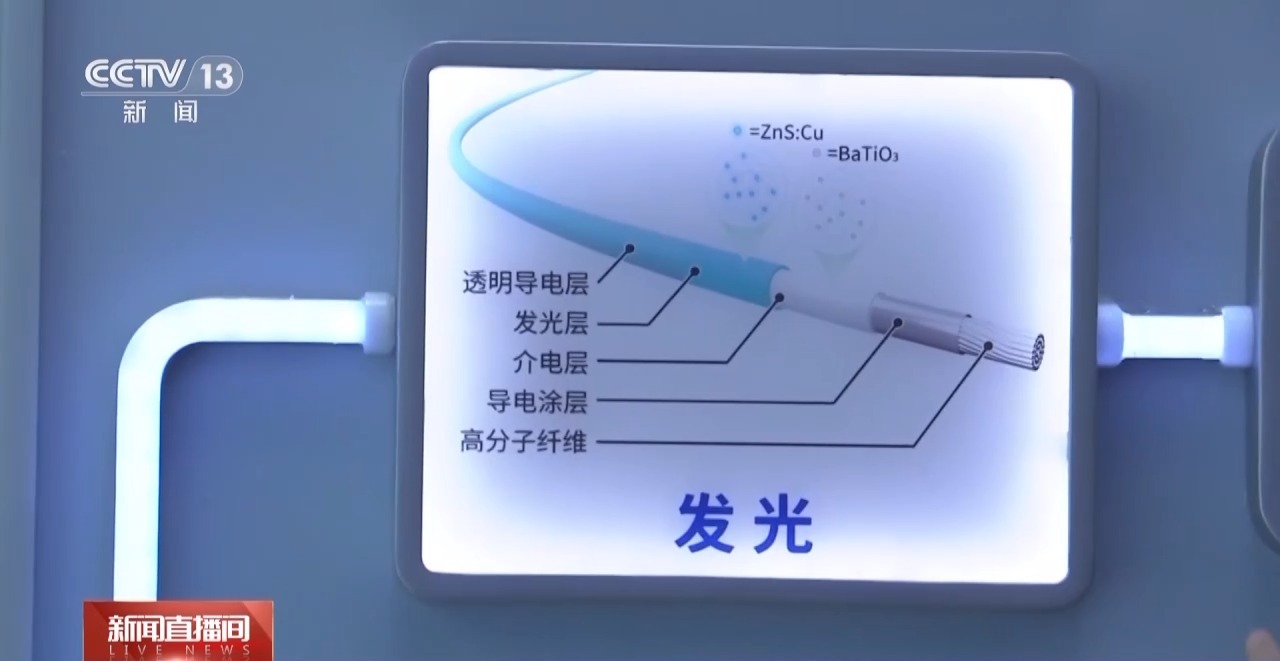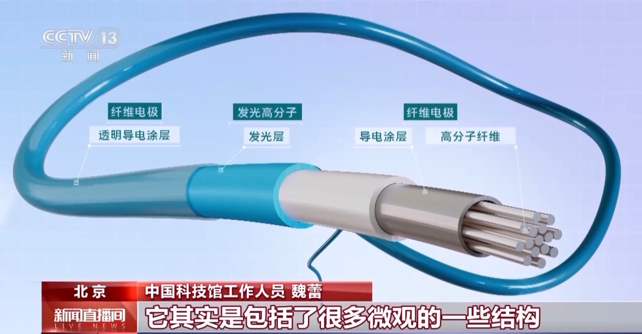 中国科技馆工作人员 魏蕾:这种新型的电子织物,它的核心就在一根根可以导电的纤维上。在这根小小的纤维上,它其实包括了很多微观的结构,在给它施加交流电之后,可以使得发光层产生发光的现象。