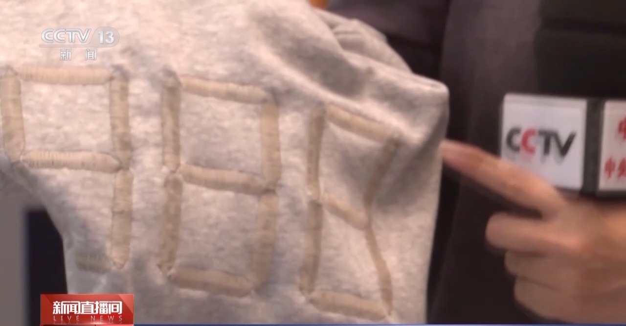 总台央视记者 张春玲:您看这件衣物,它可不是一个普通的衣服,它上面缝制的是电子纤维,电子纤维就好像是一个电子器件,可以把普通衣物变身成一个电子产品,随身携带。