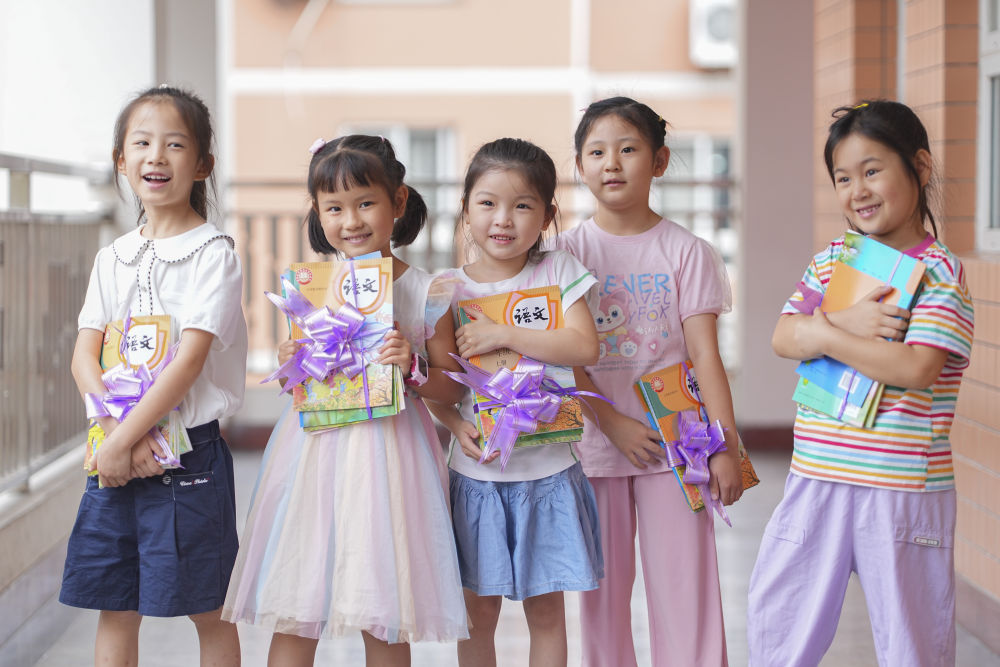 8月30日,重庆市北碚区朝阳小学一年级新生抱着新书在校园玩耍。新华社发(秦廷富摄)