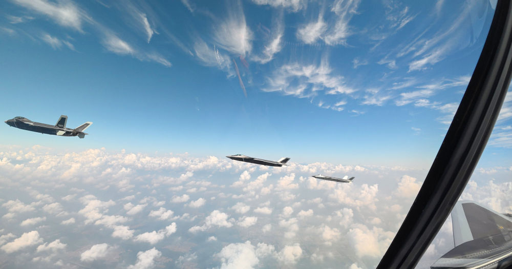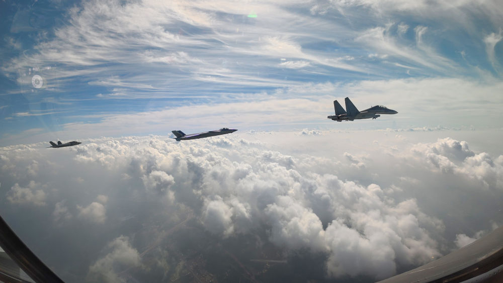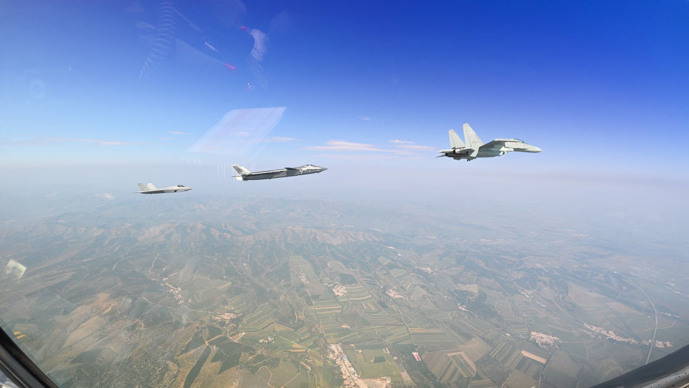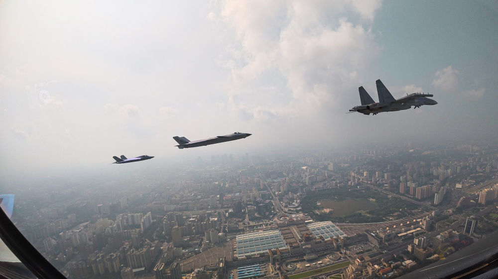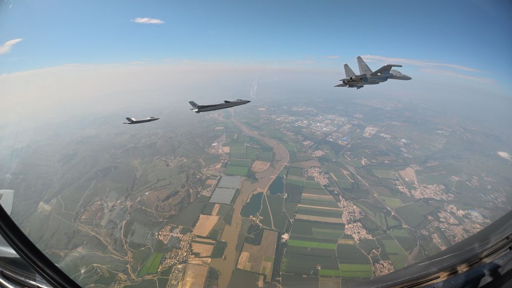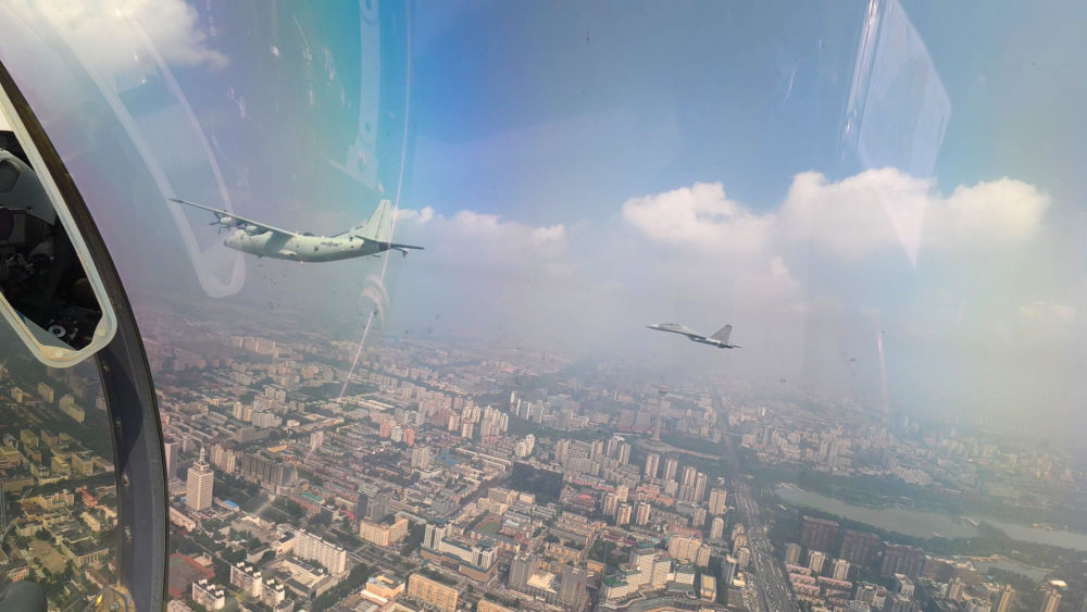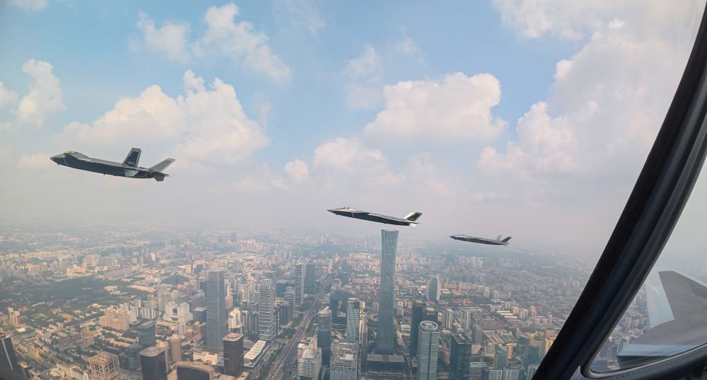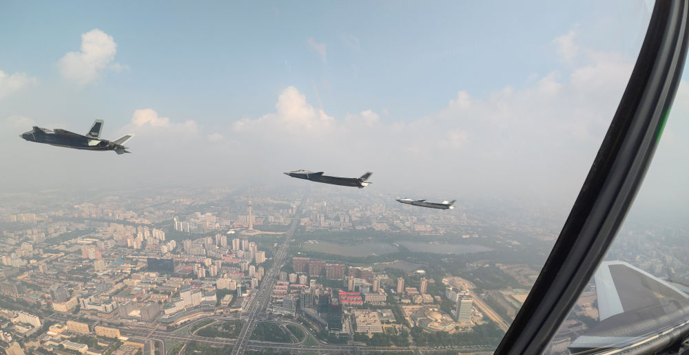 ↑这是歼击机梯队从北京城区上空飞过。