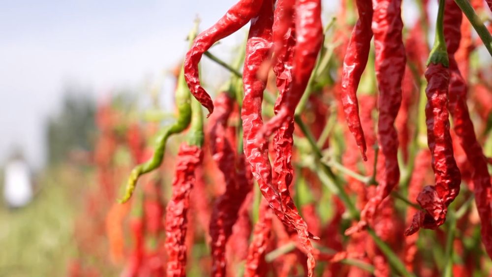 眼下,新疆巴音郭楞蒙古自治州焉耆县的14万亩工业辣椒进入采收季,种植户抢抓晴好天气采摘辣椒。