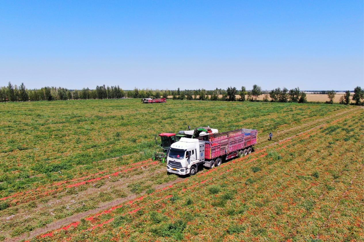 新疆吉木萨尔县番茄采收机正在田间来回穿梭(吴欣昊 摄)