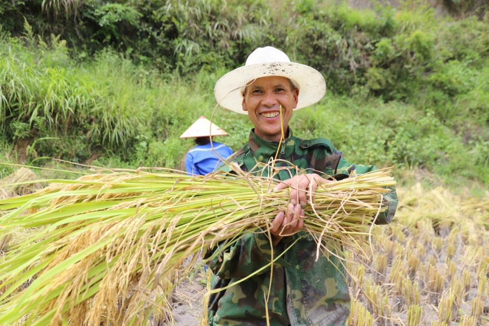贵州省黔东南州镇远县报京乡的农户展示稻穗,脸上洋溢着笑容(央广网发 张佳怡 摄)