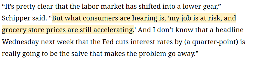 美国圣托马斯大学副教授泰勒·施普尔 (Tyler Schipper)认为 :对普通消费者来说,耳边最真切的声音是“我的工作随时可能保不住”,是“超市里的食品杂货价格还在一个劲往上涨”。所以我实在不确定,下周“美联储降息”的头条新闻,真能成为化解这些现实困境的良药吗?