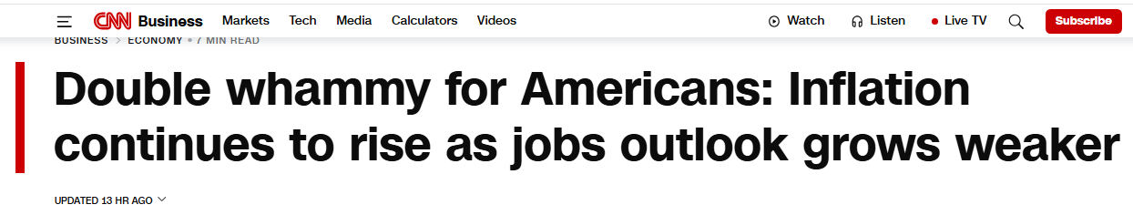CNN报道称,一边是通胀持续上涨,一边是就业市场显露疲态,双重压力下美联储陷入尴尬抉择。