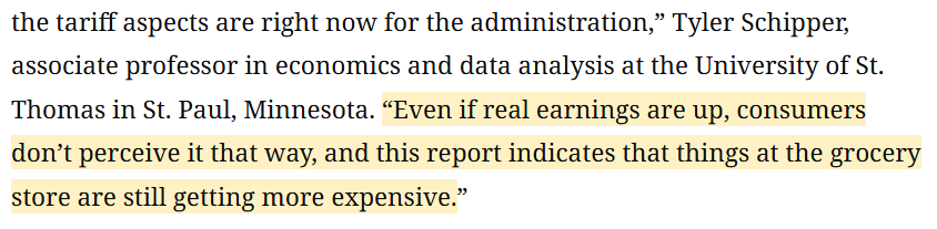 经济学家泰勒•施皮珀(Tyler Schipper)直言:“老百姓感受不到工资上涨,他们只知道超市商品的价格越来越贵。”