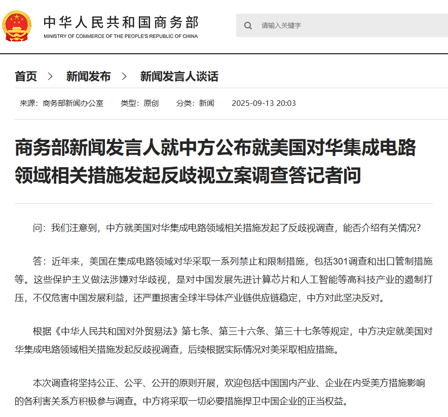 根据《中华人民共和国对外贸易法》第七条、第三十六条、第三十七条等规定,中方决定就美国对华集成电路领域相关措施发起反歧视调查,后续根据实际情况对美采取相应措施。