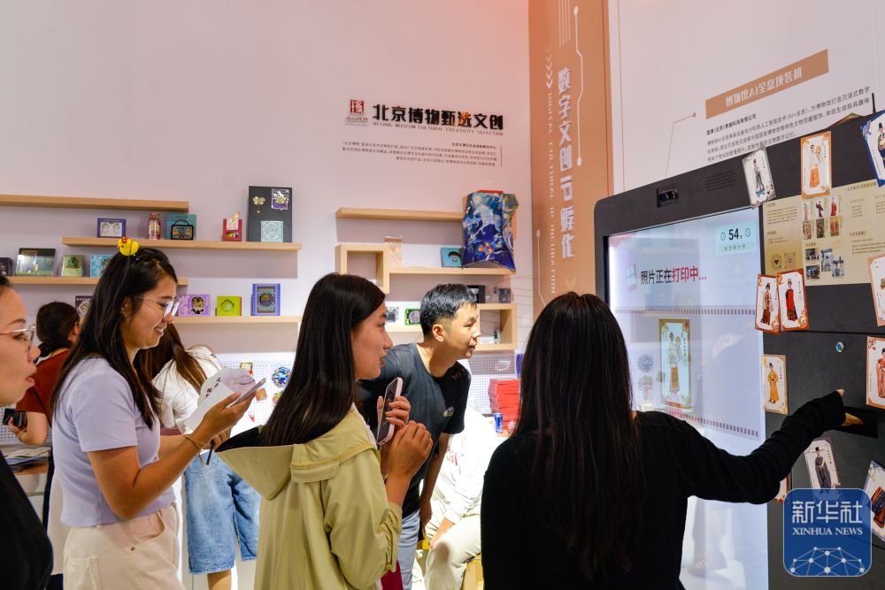 ↑ 9月12日,在北京首钢园,参展者在2025年服贸会文旅服务展馆北京市文物局展台体验博物馆AI全息换装机拍照。