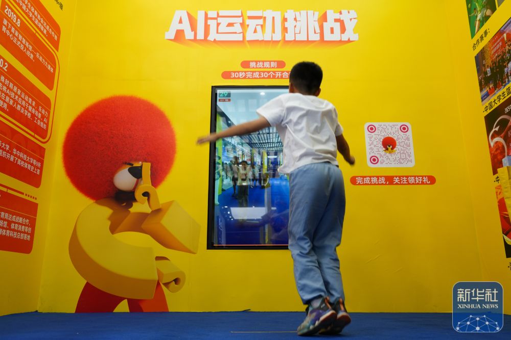 ↑ 9月13日,在体育服务专题展区橙狮慧影展台,小朋友体验“AI运动挑战”项目。