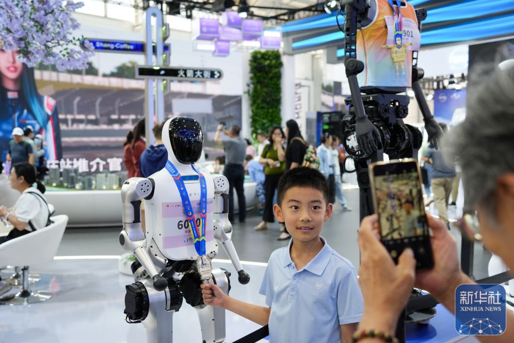 ↑ 9月13日,在电信、计算机和信息服务专题展区北京方案展展台,小朋友和机器人马拉松比赛获奖机器人合影。