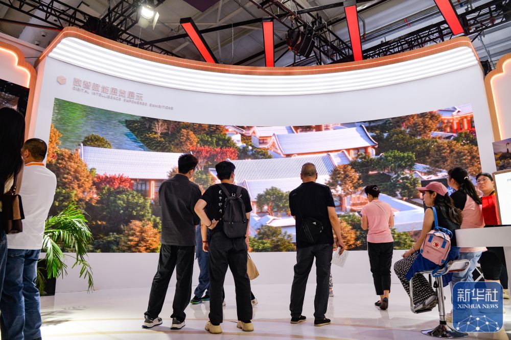 ↑ 9月13日,在北京首钢园,参展者在2025年服贸会文旅服务展馆北京市文物局展台观看、了解数智赋能展览展示。