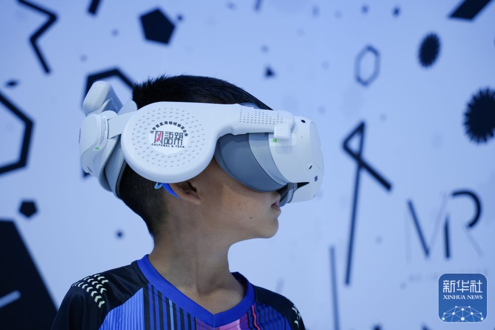 ↑ 9月13日,在文旅服务专题展区风雨筑展台,小朋友体验VR项目“梦回圆明园”。