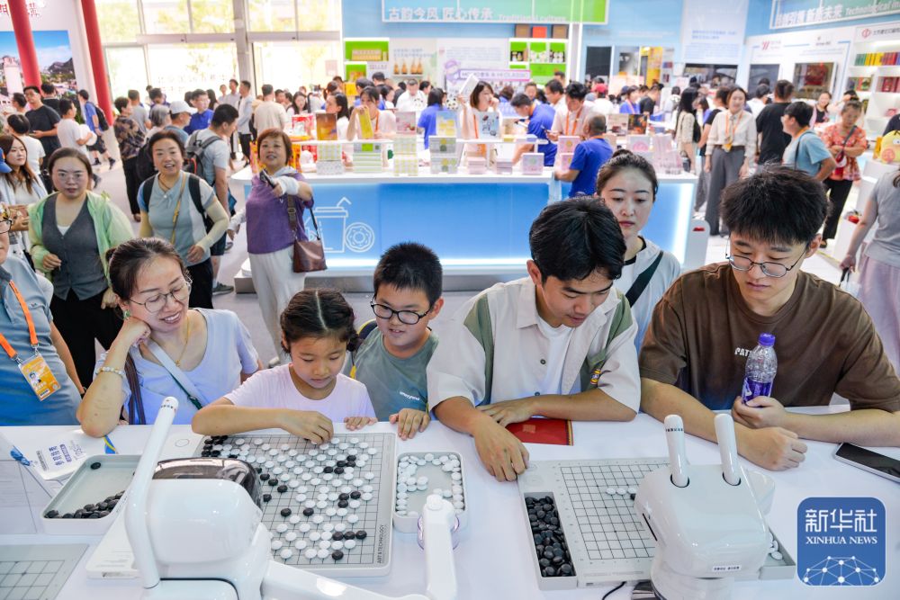 ↑ 9月13日,在文旅服务专题展区经开区展台,小朋友和机器人下五子棋。