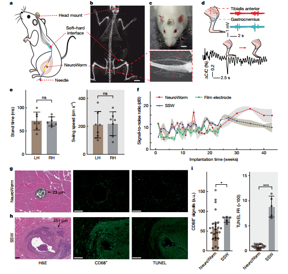 其更深远的价值在于“长期监测”能力。在动物实验中,研究团队通过极小的切口将NeuroWorm植入大鼠肌肉,连续记录稳定的生理信号超过43周,且在植入54周后仍未引发明显的组织反应或纤维化包裹,展现出在同类器件中极为罕见的长期稳定性和生物相容性。与传统临床导线类纤维相比,NeuroWorm对周围组织的干扰极小,信号质量优异,显示出巨大的临床转化潜力。其13个月的体内留存能力,使其能够像“神经监护仪”一样,持续捕捉帕金森病、阿尔茨海默病等疾病的早期信号。“这就像可穿戴设备监测心率一样,它能提前发现神经异常,在症状出现前发出预警。”严威解释道,这为神经疾病的“早期干预”开辟了新的途径。