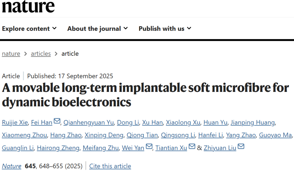 《自然》(Nature)上发表了研究论文《面向动态生物电子学的可移动长期植入软纤维》(A movable long-term implantable soft microfibre for dynamic bioelectronics)。 本文图片均为 东华大学 供图