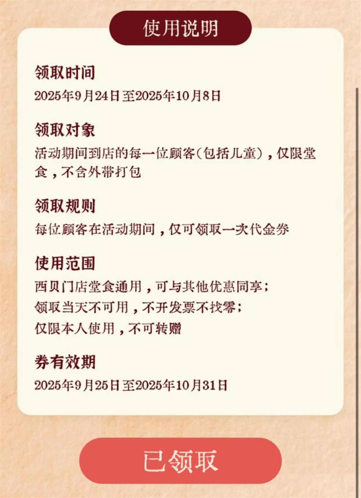 据了解,西贝此前推出代金券活动时曾明确写明:每个账号在活动期间仅可领取一次代金券,代金券全国门店通用,仅限堂食。