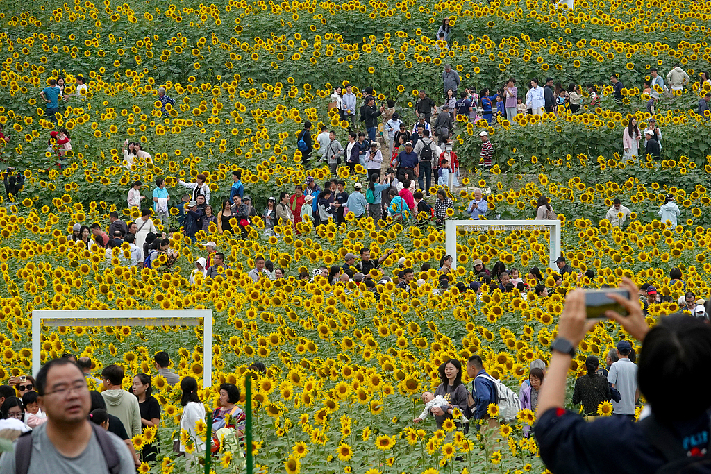 2025年10月3日,北京温榆河公园芸上梯田景区里的向日葵花盛开,吸引来众多游人前来观赏拍照。视觉中国 图