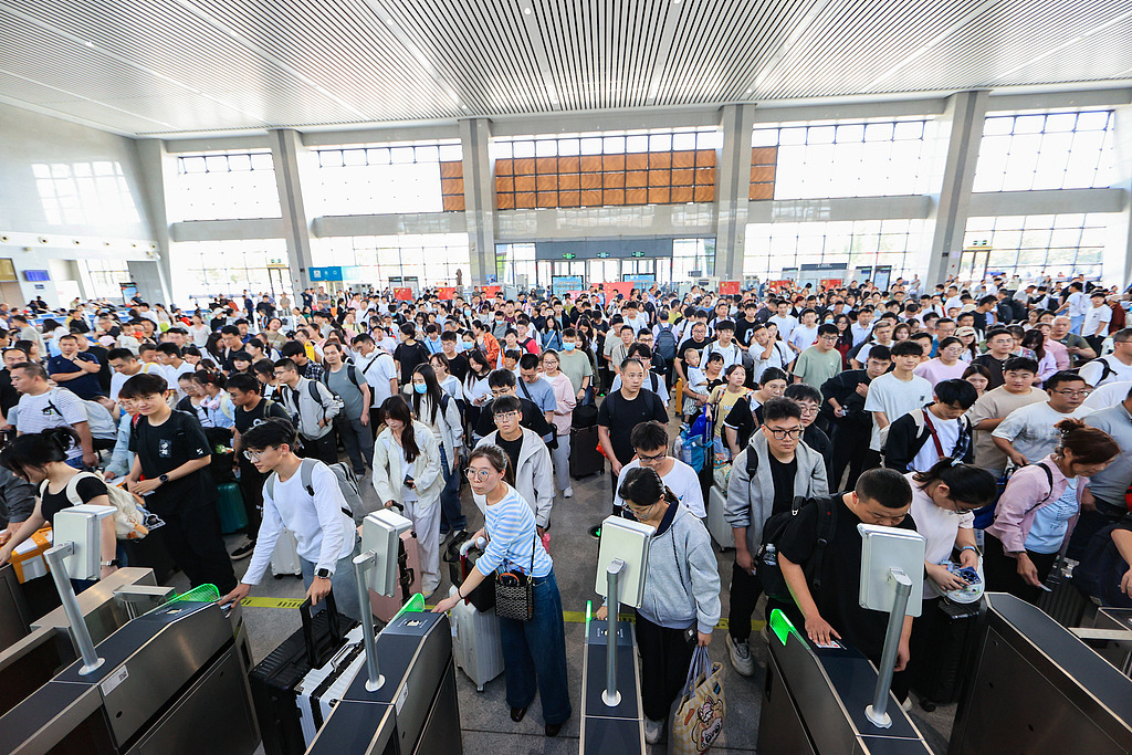 2025年10月6日,在江苏省连云港市赣榆站,旅客排队通过检票闸机准备乘车。视觉中国 图