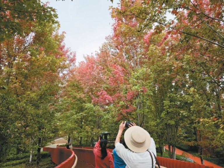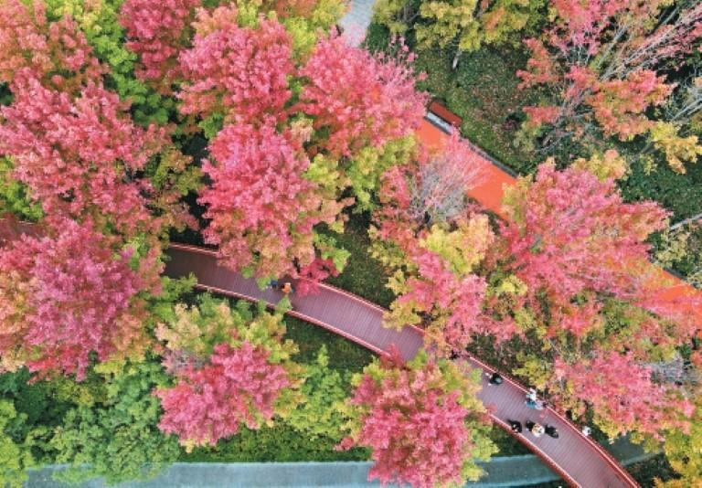 组图:10月7日,西安幸福林带枫叶进入最美观赏期,红黄绿叶片交织如画,红色栈道如丝带穿梭其间。从空中俯瞰,栈道与枫林组成绝美画卷;游客或拍照或漫步,沉浸式享受秋日浪漫。