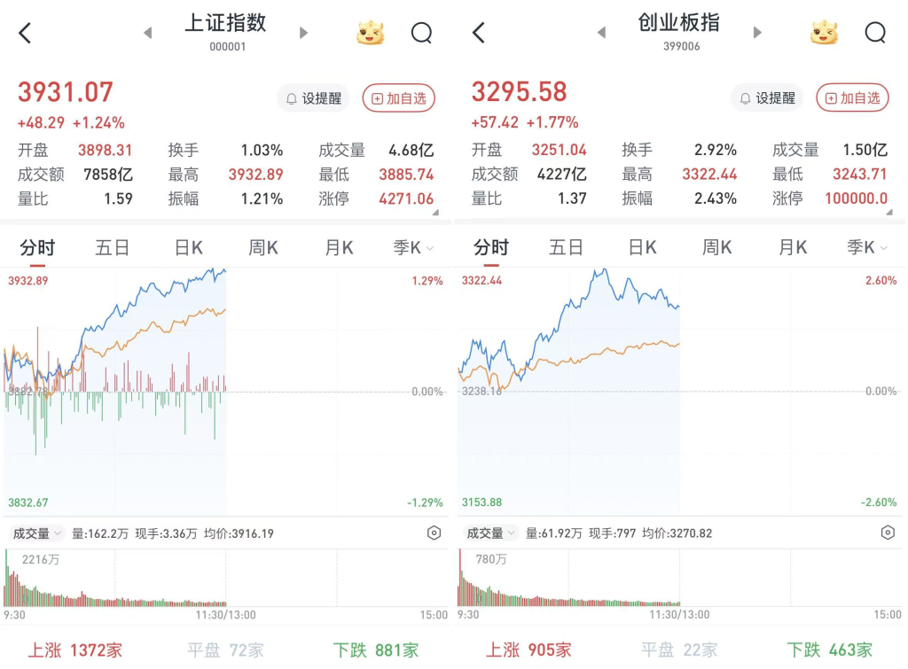 至午盘,上证综指涨1.24%,报3931.07点;科创50指数涨5.59%,报1578.88点;深证成指涨1.75%,报13763.88点;创业板指涨1.77%,报3295.58点。
