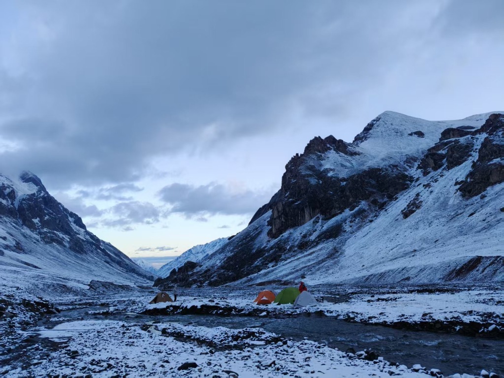 接着,杨豪和队友下行至河谷,继续穿越。他记得那时白天气温在15度左右,到了晚上,下雪后气温跌至零下5度左右。翻越垭口前,他遇到下撤的队伍,对方担心因下雪遭遇事故。