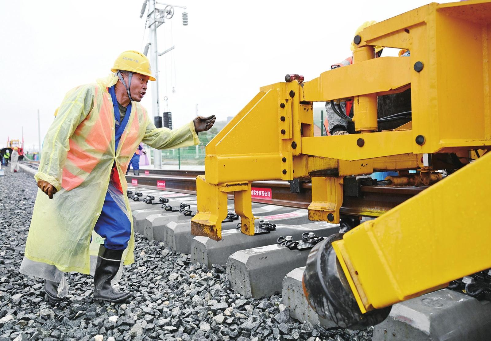 图为施工人员在西康高铁西安东站至牛背梁站区间铺轨现场作业。新华社记者 李一博 摄