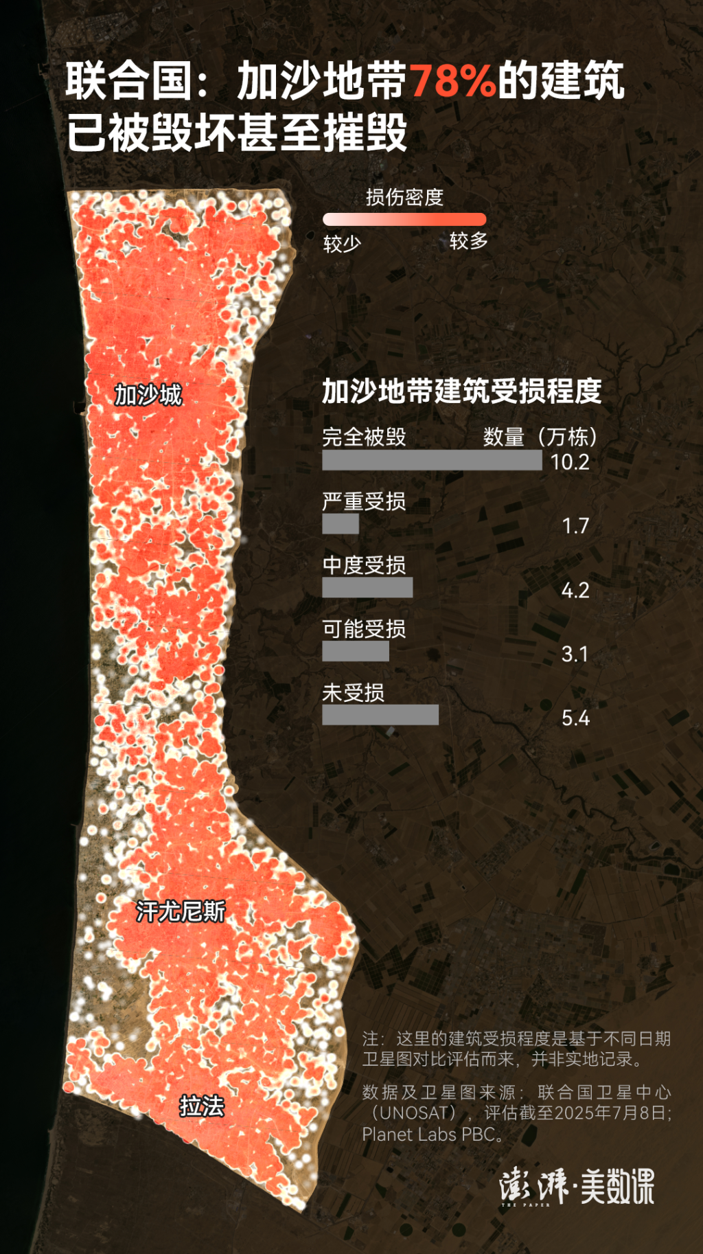 今年8月,联合国通过卫星图对此次巴以冲突进行全面评估后发现,截至2025年7月,加沙地带已有约78%的建筑物遭到损坏或摧毁,其中已有10.2万栋建筑物完全被毁。