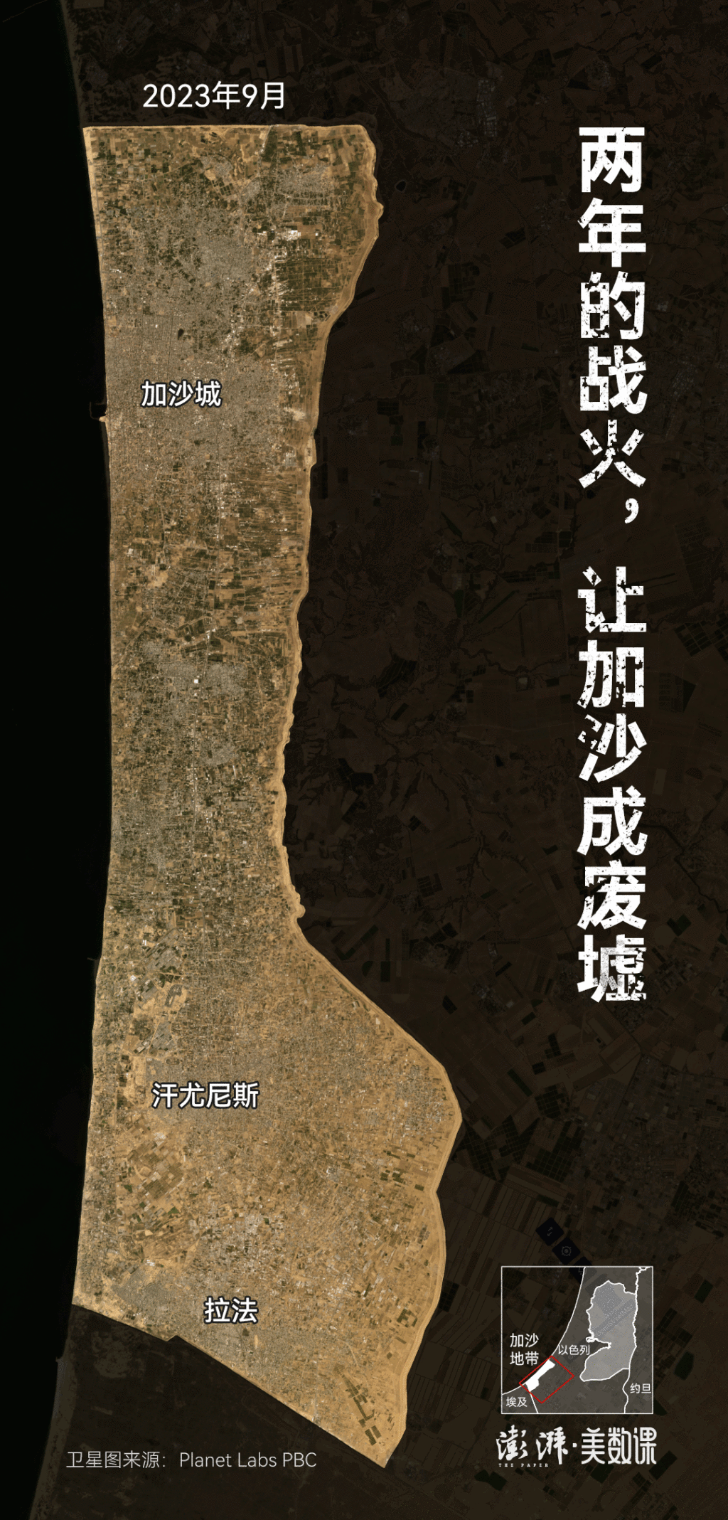 经过2年时间的空袭、炮击甚至是推土机和挖掘机的破坏,这里早已面目全非。通过对比2023年9月和2025年9月的卫星图,可以直观地看到加沙地带多数地区已成焦土瓦砾。