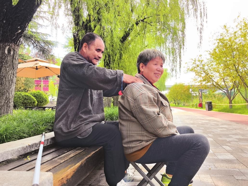 10月13日上午,雨过天晴,阳光洒在雁鸣湖休闲公园的步道上。59岁的盲人闫红娃与妻子韩运利手挽着手前行,闫红娃步伐稳健,神情安然,妻子的目光不时落在他身上,轻声提醒着前方的障碍物。这一幕,是他们16年婚姻生活的日常。